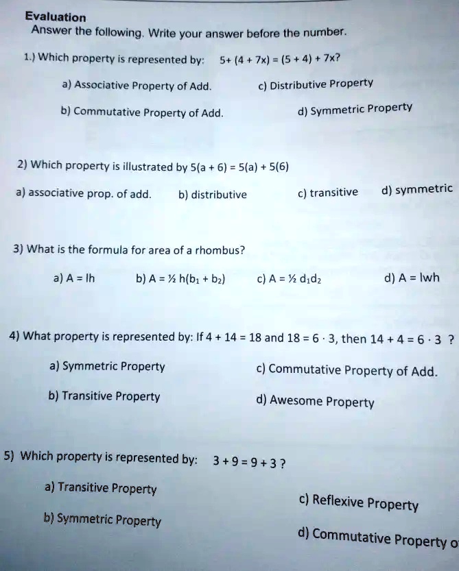 Solved Evaluation Answer The Following Write Your Answer Before The Number 1 Which Property Is Represented By 5 4 7x 5 4 7x A Associative Property Of Add